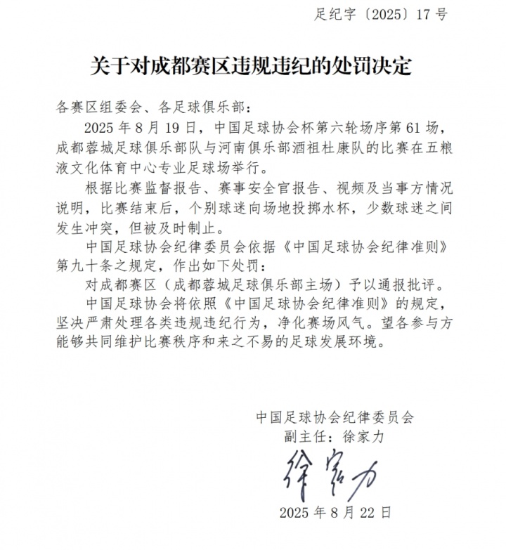 2025年8月21日,成齐市公安局金牛区别局发布警情通报,足协杯半决赛后肇事三东谈主被行政拘留。