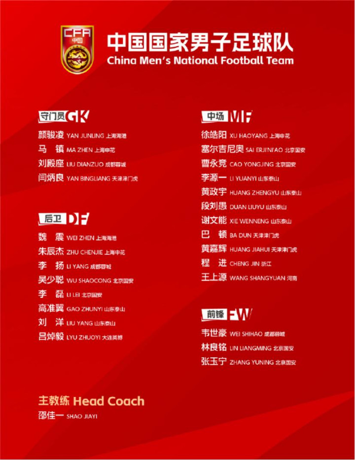 与此同期,中国男足在广东肇庆集合,邵佳一将带队于1月4日至27日先后在肇庆和阿联酋迪拜集训。稍早时刻,中国男足公布了26名球员的集训名单,其中李扬、闫炳良和吕焯毅3东谈主为首次干涉国足大名单,而归化球员仅剩下塞尔吉尼奥一东谈主。