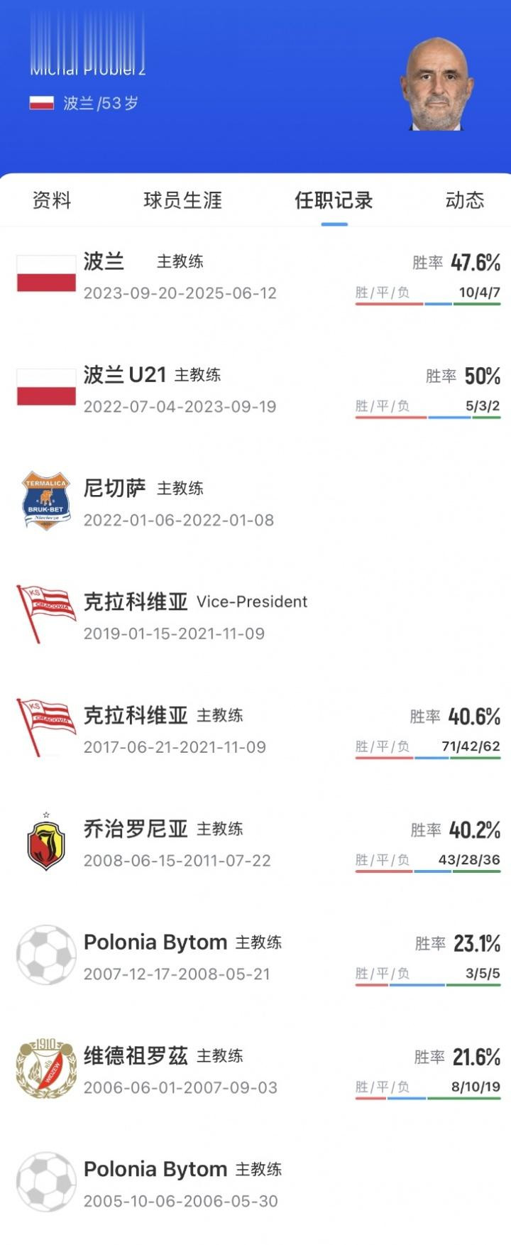 直播吧11月05日讯据中国足协官方音讯,45岁青岛西海岸主帅邵佳一出任中国国度队新任主帅,媒体东说念主不懂球专栏暗示,入围国足主帅临了名单的两个外教是普罗别日和拉巴迪亚。拉巴迪亚此前曾抓教过斯图加特,普罗别日此前曾是波兰国度队主教化。