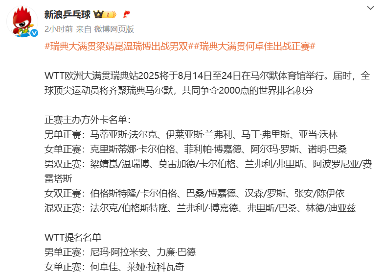 北京时分8月6日,WTT官方揭晓了瑞典大满贯正赛外卡与提名名单,中国球迷的眼光斯须聚焦于男单正赛名单中阿谁熟谙的名字,梁靖崑表示在列,更引东谈主瞩方向是,他不仅一手一脚重返战场,更将联袂瑞典原土选手温瑞博,构成跨国组合,并肩修复男双赛场,这无疑了了宣告:因伤缺憾退出横滨冠军赛的梁靖崑,已负责详情将在8月14日揭幕的WTT瑞典大满贯赛场上强势回来