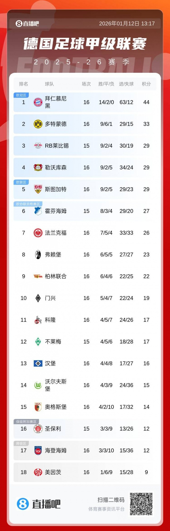 直播吧01月12日讯德甲第16轮,拜仁8-1狂胜沃尔夫斯堡,半程还差一场,球队照旧是51个净胜球+11分领跑德甲。